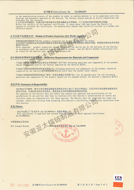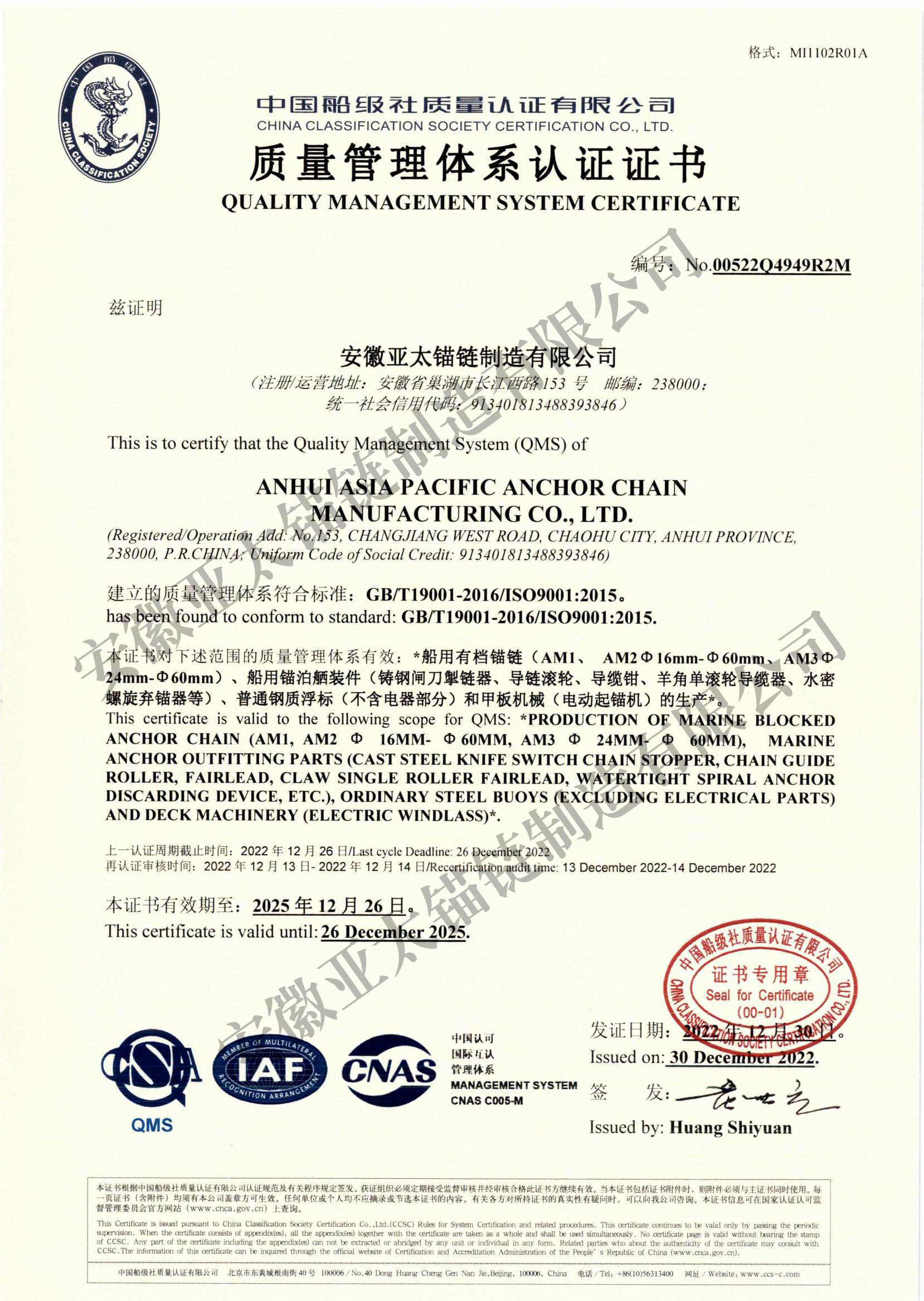 安徽亞太錨鏈制造有限公司是國家高新技術(shù)企業(yè),也是國家GB/T 549-2017《電焊錨鏈》標(biāo)準(zhǔn)的起草和制定單位之一。公司旗下設(shè)有錨鏈分廠、浮標(biāo)分廠、舾裝件分廠等多個分廠。公司專業(yè)從事φ12.5mm-φ107mm二、三級船用錨鏈、浮標(biāo)錨鏈、錨鏈附件,錨、船舶曬裝產(chǎn)品、航標(biāo)、系船浮、船型標(biāo)、多種規(guī)格海洋監(jiān)測浮標(biāo)及航標(biāo)燈等產(chǎn)品的生產(chǎn)、安裝和服務(wù)。目前公司的產(chǎn)品銷往全國各地船廠、碼頭、航標(biāo)處、航道局、海洋局,并已走上國際市場,如東南亞、中東、歐美等國家。